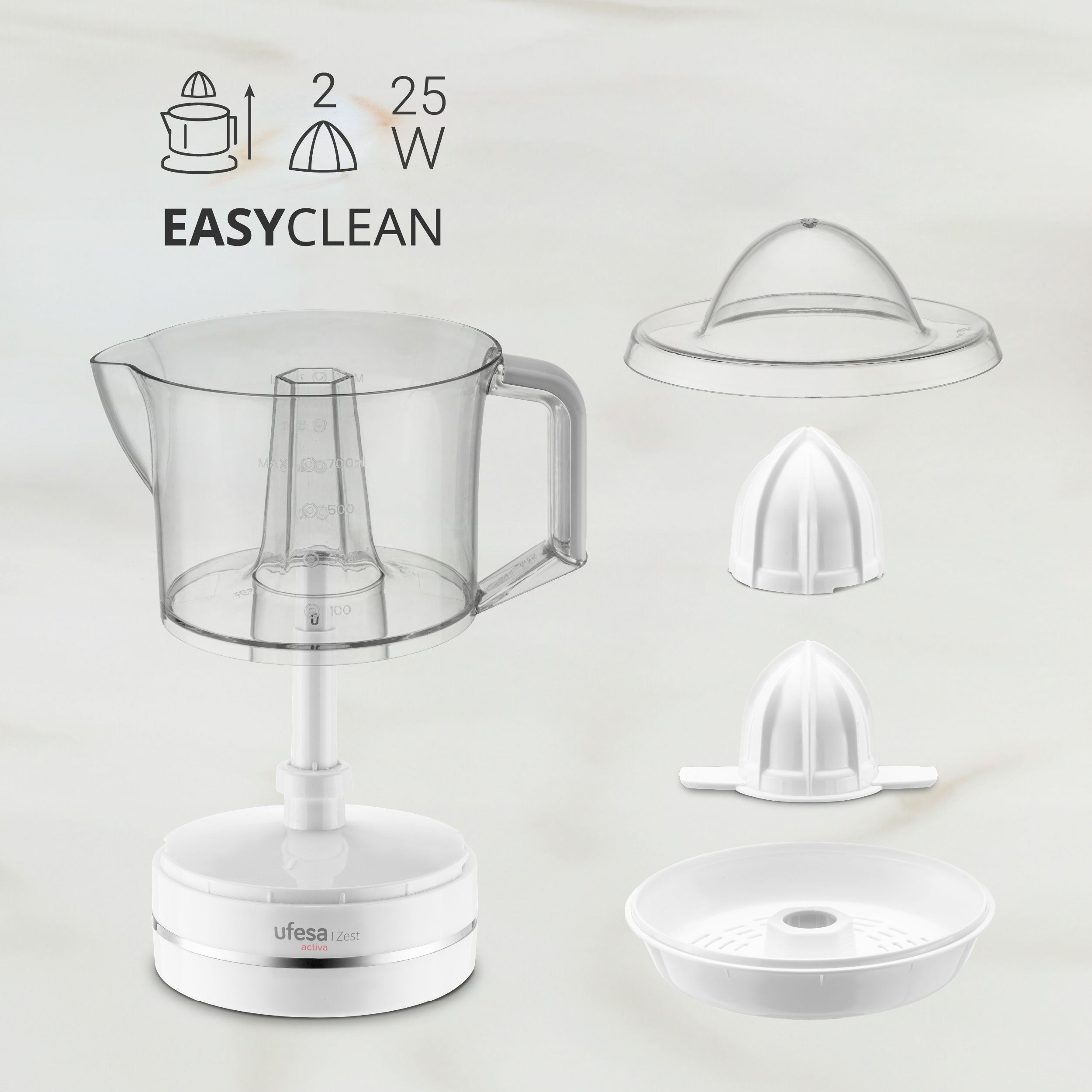 El Zest Activa es libre de BPA, cuenta con marcas de escala para medir el jugo con precisión y dispone de una cubierta antipolvo, que protege el exprimidor cuando no está en uso. Con un peso de 0,64 kg y dimensiones compactas de 190 x 140 x 205 mm, es ligero, manejable y fácil de almacenar en cualquier cocina.